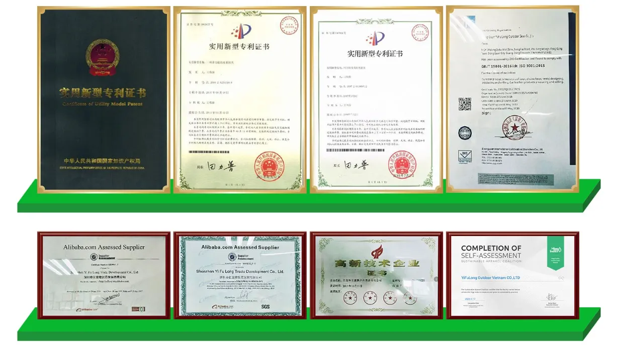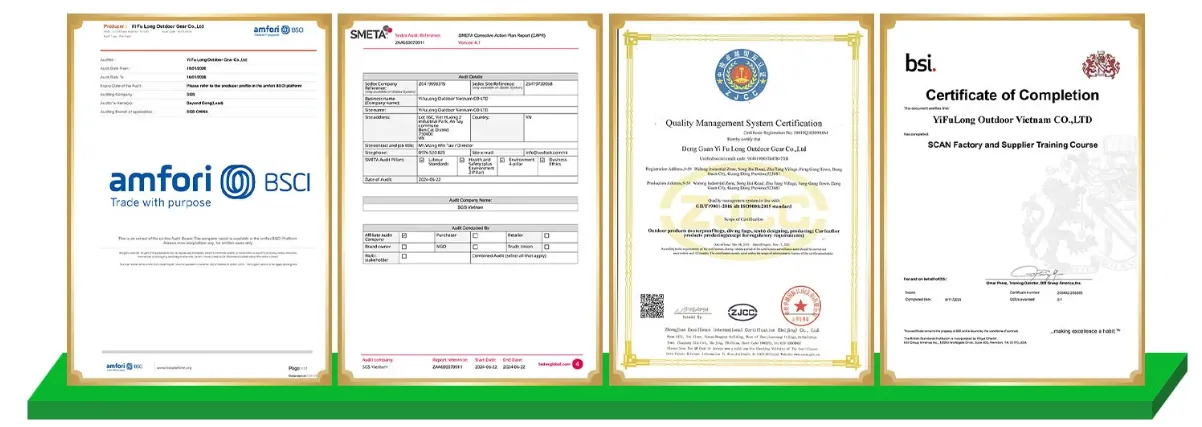 Zaporedoma smo pridobili številne avtoritativne certifikate, vključno z ISO 9001 za upravljanje kakovosti, BSCI/SMETA za družbeno odgovornost in Higgovim indeksom za okoljsko trajnost.
